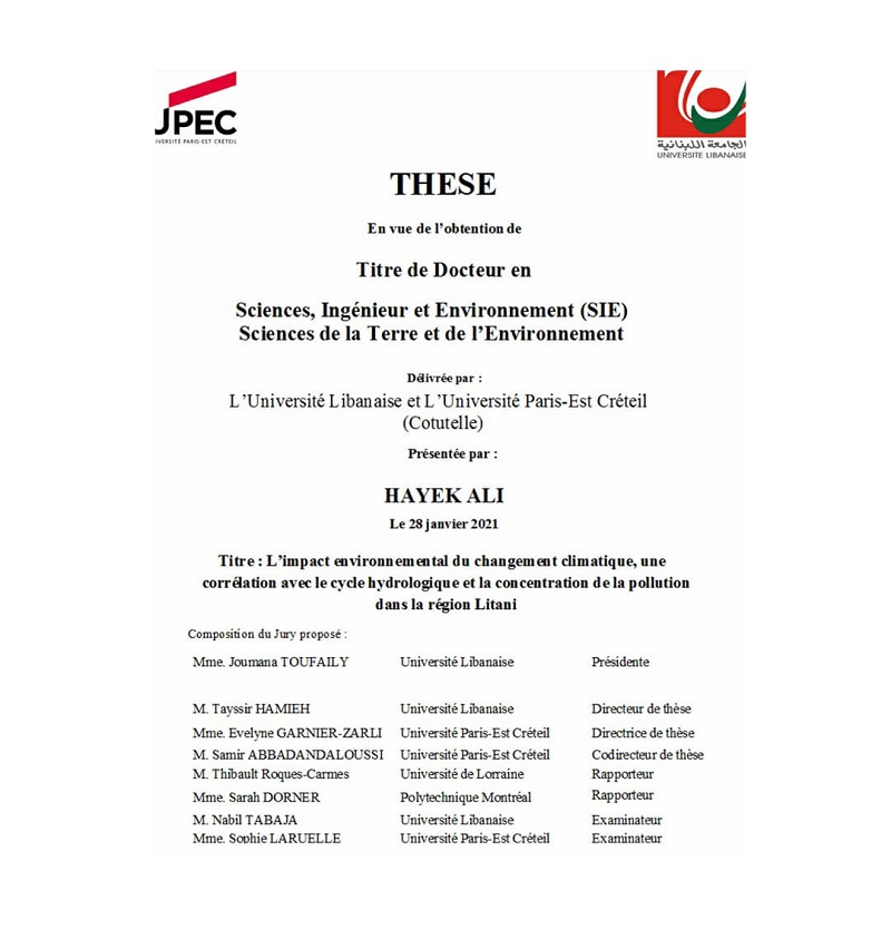وفي هذا الإطار، أضيف إنجاز جديد للفريق البحثي في كل من مختبر المواد والتحفيز والبيئة والطرائق التحليلية (MCEMA) بإدارة البروفسور تيسير حمية ومختبر الدراسات التطبيقية للتنمية المستدامة والطاقة المتجددة (LEADDER) بإدارة البروفسورة جومانا الطفيلي في الجامعة اللبنانية في دراسة أصيلة جديدة نوعية ورائدة في أطار تعاون لبناني فرنسي ضمن أطروحة دكتوراه مشتركة بين الجامعة اللبنانية وجامعة Université Paris-Est Créteil قام بها الطالب المهندس علي جميل حايك ونال درجة الدكتوراه من كل من الجامعتين بدرجة مشرِّف جداً مع تهاني لجنة التحكيم المكوَّنة من أعضاء من كل من فرنسا وكندا ولبنان.