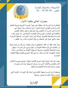 تُعلمكم إدارة المدرسة أنّه، حفاظًا على هيبة المؤسسة التربوية وصونًا للنظام العام واحترام القوانين المرعية الإجراء، فإن أي طالب يثبت تورطه في الإساءة إلى المدرسة أو التعرّض لها بأي فعل أو قول مخالف للقانون والأنظمة في الواقع أو على وسائل التواصل الاجتماعي، قد عرّض نفسه للمساءلة والملاحقة القانونية، إضافة إلى اتخاذ الإجراءات المسلكية الصارمة بحقه، والتي تصل إلى ملاحقته من قبل المخابرات كما وبدأ بالفعل.