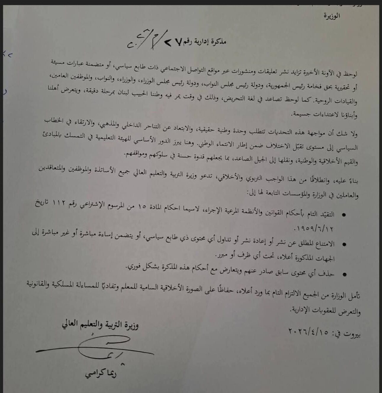 بوابة التربية: اصدرت وزيرة التربية والتعليم العالي ريما كرامي مذكرة إدارية حملت الرقم ٧ / م / ٢٠٢٦، منعت بموجبها العاملين في القطاع التربوي من تداول اي محتوى ذو طابع سياسي. وجاء في المذكرة: لوحظ في الآونة الأخيرة تزايد نشر تعليقات ومنشورات عبر مواقع التواصل الاجتماعي …