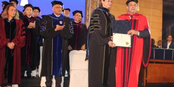 تسلمت وزيرة الداخلية والبلديات ريا الحفار الحسن شهادة دكتوراه فخرية من جامعة بيروت العربية، خلال حفل التخرج الذي اقيم في فرع الجامعة بطرابلس، لمناسبة تخرج الدفعة السادسة وضمت 328 متخرجا ومتخرجة من كليات إدارة الأعمال، والعمارة والهندسة والعلوم والعلوم الصحية. حضر الإحتفال الدكتور عبد الإله ميقاتي ممثلا الرئيس نجيب ميقاتي، …