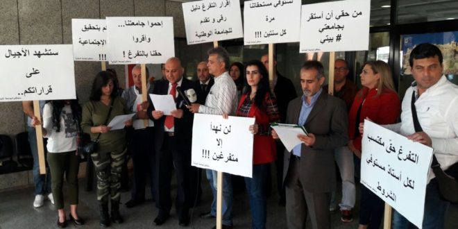 نفدت لجنة المتابعة لقضية الاساتدة المتعاقدين بالساعة في الجامعة اللبنانية اعتصاما رمزيا أمام مبنى الإدارة المركزي للجامعة – المتحف، للمطالبة بالتفرغ. رفعت في الإعتصام لافتات أكدت أن التفرغ حق لكل أستاذ متسوفي للشروط، مطالبين بحماية الجامعة من خلال إقرار الحق بالتفرغ. وتلا الدكتور هلال درويش بيانا باسم اللجنة، …