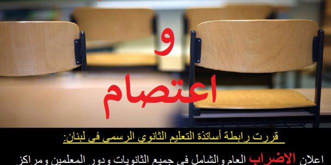 أكدت رابطة معلمي التعليم الاساسي الرسمي “استمرار الإضراب في المدارس التي تستقبل الطلاب النازحين في دوام بعد الظهر، حتى تنفيذ قرار احتساب ساعة المدير والناظر والموجه والمرشد الصحي 18 الف ليرة كما جاء في قرار وزيري التربية والمالية منذ العام 2014، والإفراج عن مستحقات المعلمين المتعاقدين …