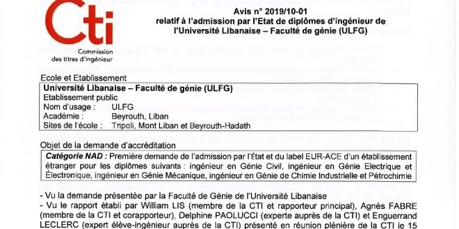 بوابة التربية: منحت هيئة الألقاب الهندسية في فرنسا (CTI – Commission des Titres d’Ingénieur) كلية الهندسة في الجامعة اللبنانية اعتمادها الخاص ببرامج الهندسة، كما نالت الكلية الاعتماد الأوروبي للجودة في برامج ماستر الهندسة (EUR- ACE – European Accredited Engineer). وأعلنت الكلية في بيان اليوم، أن نيل هذا الاعتماد “يشكل إنجازا لكلية …