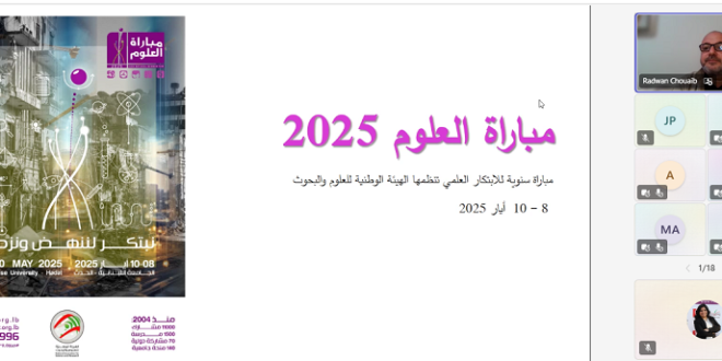 بوابة التربية: عقدت الهيئة الوطنية للعلوم والبحوث جلسة معلومات افتراضية عبر Microsoft Teams حول مباراة العلوم 2025، وذلك مساء يوم الأربعاء في 26 آذار 2025، بحضور حوالي مئة وخمسين معلّم/ة، طالب/ة، ومتخصص/ة في مجال التربية. افتتحت الجلسة أمينة سر الهيئة الدكتورة نينات كامل التي رحّبت بالحضور وقدّمت برنامج …
