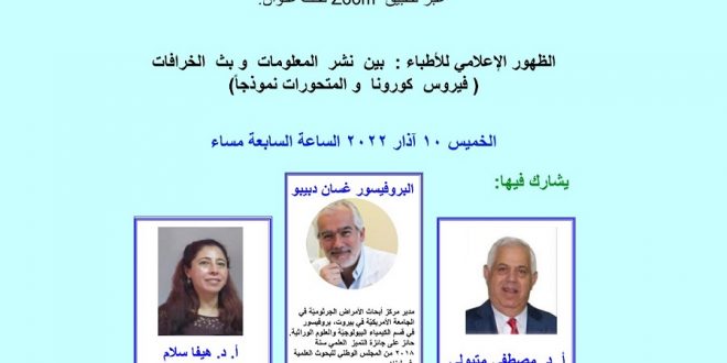بوابة التربية: دعت الرابطة العربية للبحث العلمي وعلوم الإتصال، إلى ندوة عبر تطبيق Zoom، بعنوان: الظهور الإعلامي للأطباء: بين نشر المعلومات وبث الخرافات (فيروس كورنا والمتحورات نموذجاً)، وذلك عند السابعة من مساء العاشر من آذار 2022، ويشارك فيها: د. مصطفى متبولي أستاذ جامعي وباحث في علوم الإعلام والإتصال كلية الإعلام- …