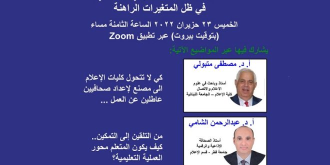 بوابة التربية: دعت الرابطة العربية للبحث العلمي و علوم الإتصال الى حضور ندوة تحت عنوان: التدريس والتكوين المهني الإعلامي في ظل المتغيرات الراهنة وذلك يوم الخميس الواقع فيه 23 حزيران 2022 الساعة الثامنة مساء (بتوقيت بيروت) عبر تطبيق Zoom. يشارك في الندوة: – أ. د. مصطفى متبولي : كي لا …